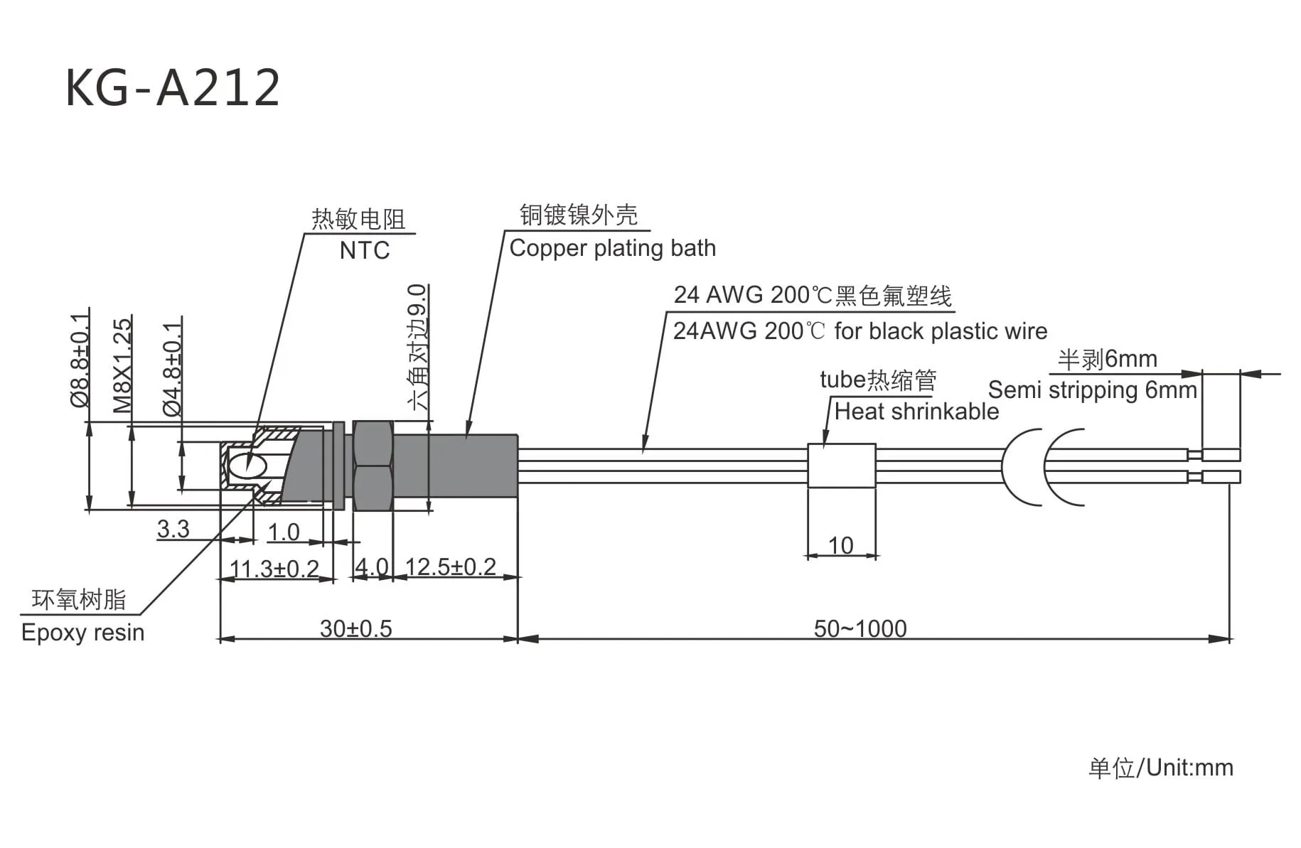 标准电阻(可按客户要求):R200℃=8KΩ±1% B150/250=5300K±3%