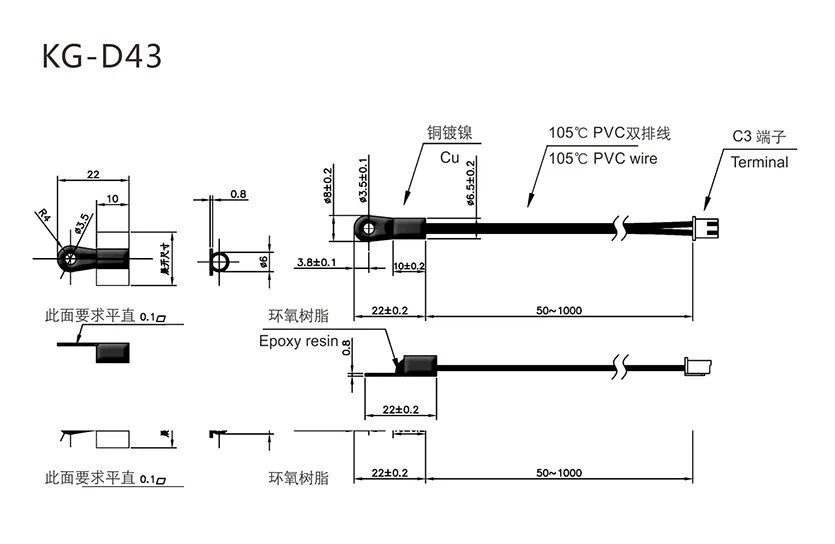 Standard NTC (Customizable):R25℃=100KΩ±2% B25/50=3950K±1%