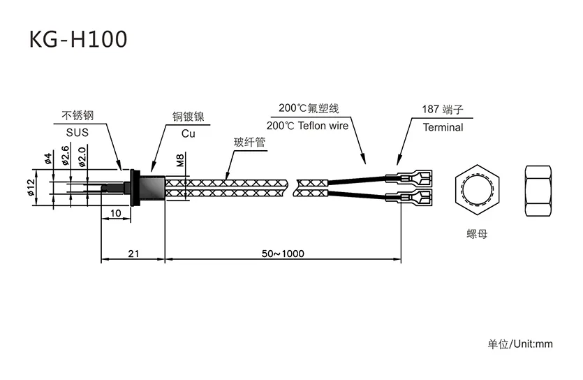 Standard NTC (Customizable):R25℃=100KΩ±1% B25/50=3950K±1%